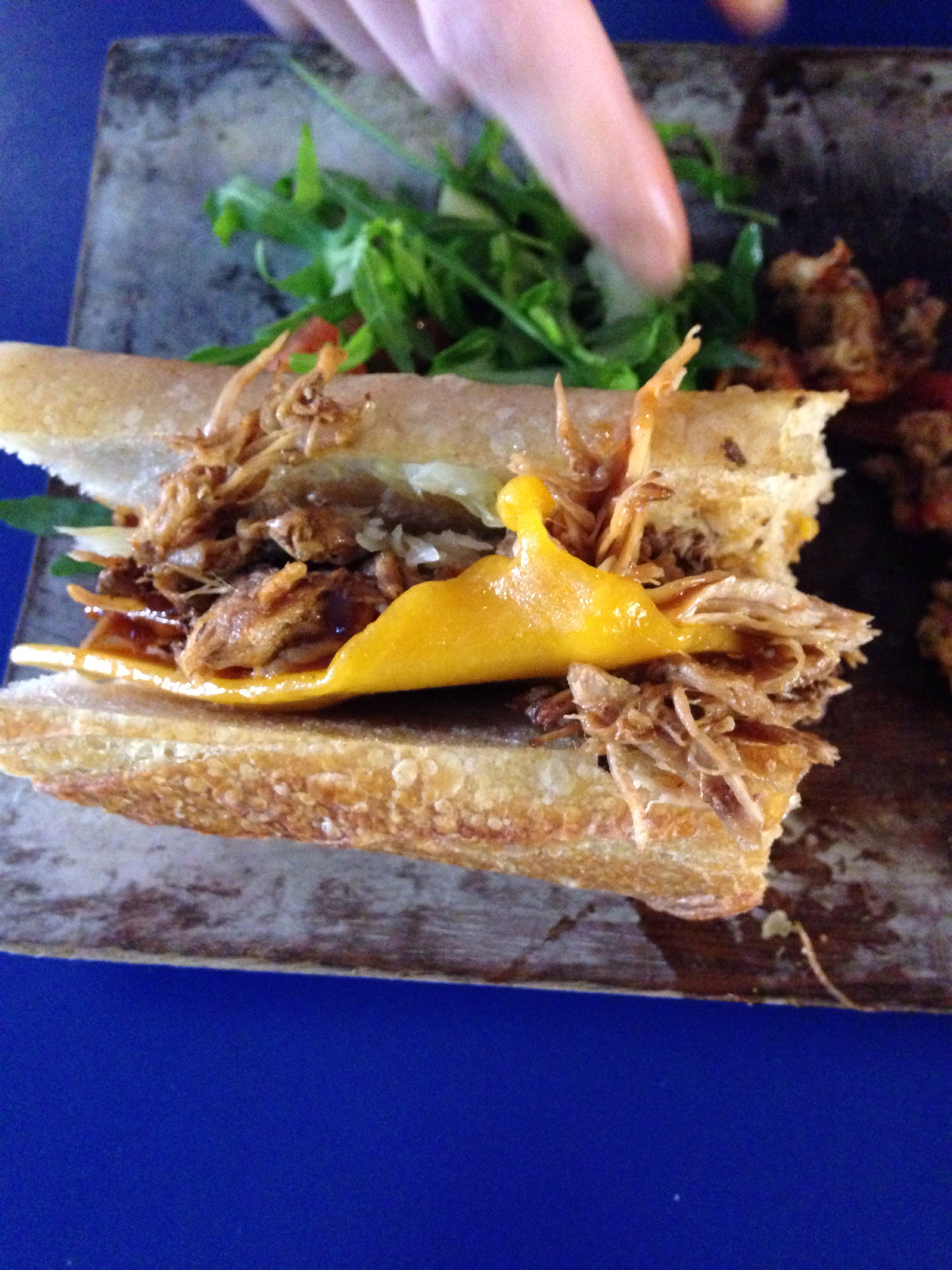 I went for the “hot to trotter” (pulled pork, homemade BBQ sauce and saurkraut) and he went for a “crayfish po’ boy” (crayfish, spicy creole mayo, shredded iceberg lettuce and tomato).