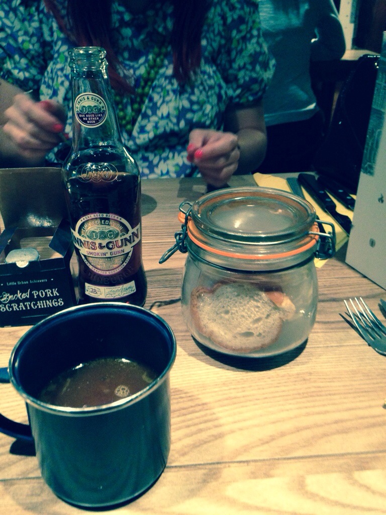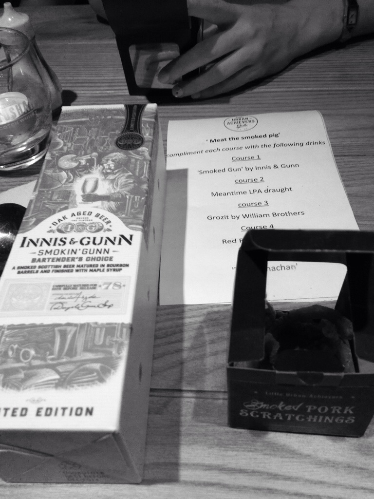 We were greeted with a complimentary Innis &Gunn limited edition “Smokin’ Gunn” beer and some smoked pork scratchings.